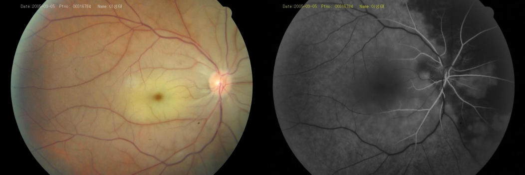 중심장액맥락망막병증은 망막의 중심부에 국한된, 경계가 분명한 장액성 감각신경망막박리 또는 망막색소상피박리가 나타나는 질환입니다. 남자가 여자보다 3~8배 정도 많고 대개 30~50대까지의 건강한 청장년층에서 많이 발생합니다. 주로 중심시력을 담당하는 황반에서 발생하므로 대부분 시력감퇴, 중심암점, 변시증, 소시증, 색각이상 등의 증상을 호소하게 됩니다.