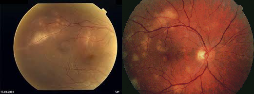 약간의 눈부심과 다양한 시력장애가 있으며 눈의 통증이나 충혈이 없습니다. 이 염증은 치료 후 생기는 흉터가 망막에 남을 수 있습니다. 망막의 중심부위가 침범되지 않을 경우 시력은 괜찮은 편이나 염증이 오래되면 시력이 많이 떨어집니다.